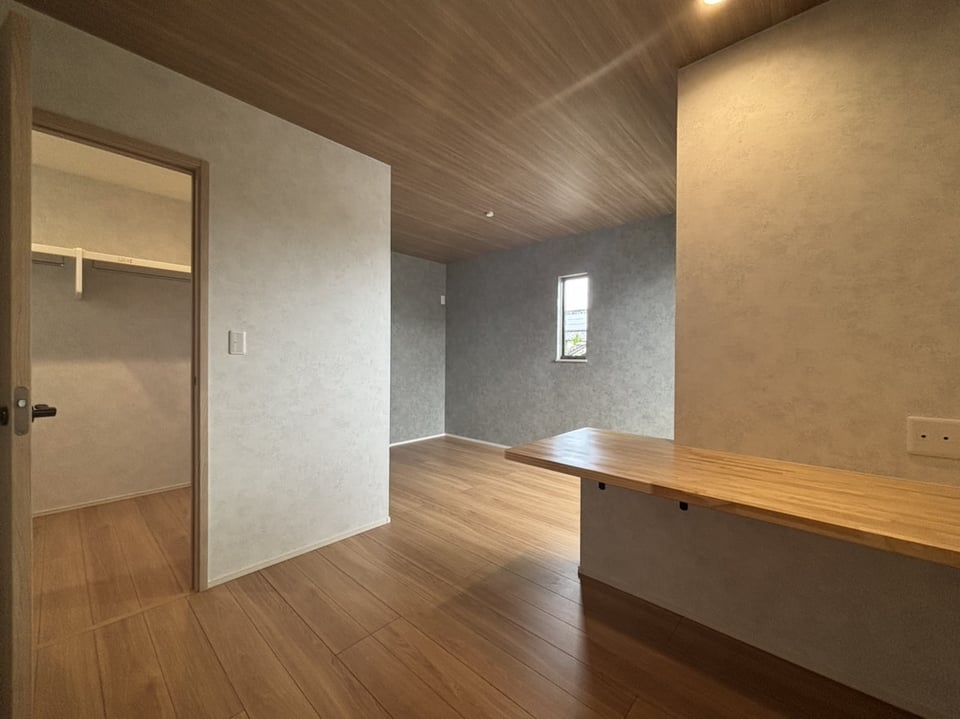 主寝室には書斎やメイクスペースとして使えるカウンターもあり、天井に木目を採用するなど温かみのあるデザインにもこだわっています。