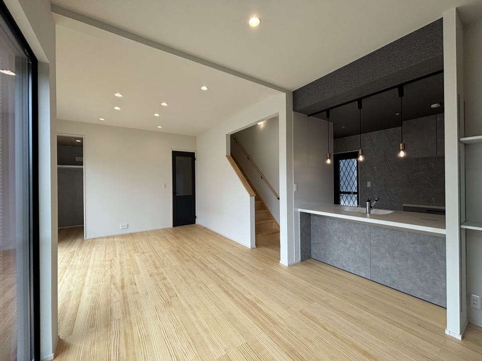 リビング・ダイニングは自然光がよく入る南側にあり、明るく爽やかな雰囲気です。温かみのある無垢フローリングと、キッチンのおしゃれなグレークロスのカラーコーディネートが絶妙で、どんなテイストの家具も合わせやすいバランスの取れたインテリアデザインに仕上がっています。