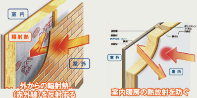 外壁・屋根に採用。高密度ポリエチレン不織布にアルミ蒸着+抗酸化樹脂コーティングで、遮熱・防水の長期性能をキープ。強靭で劣化に強いシートです。