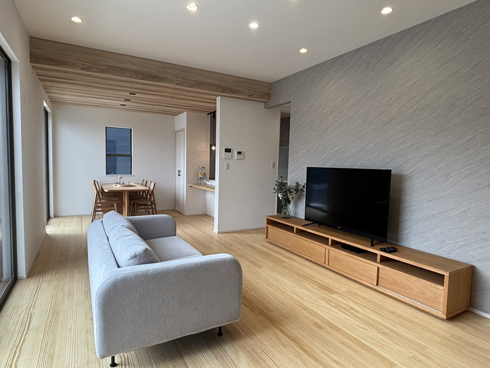 安心して過ごしやすいL型のLDK。大型窓が2つあり、開放感溢れる家