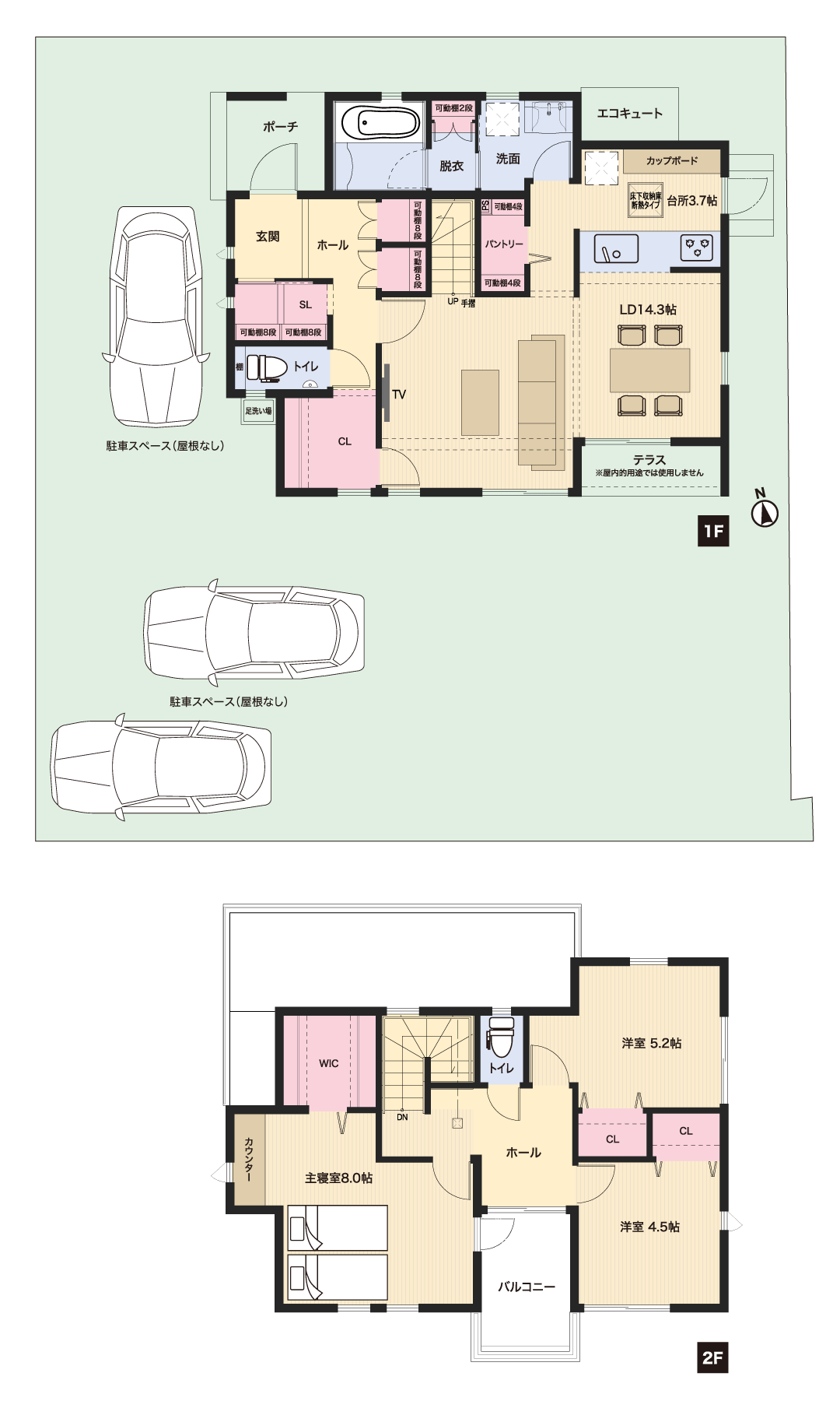 60坪以上の敷地に安心の駐車場2台分確保