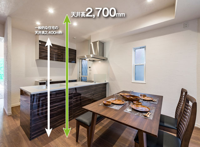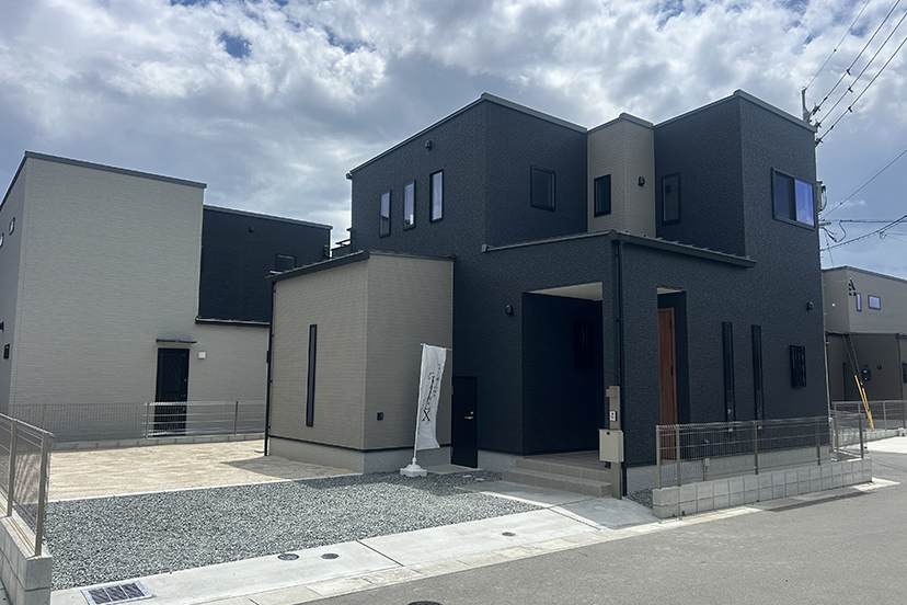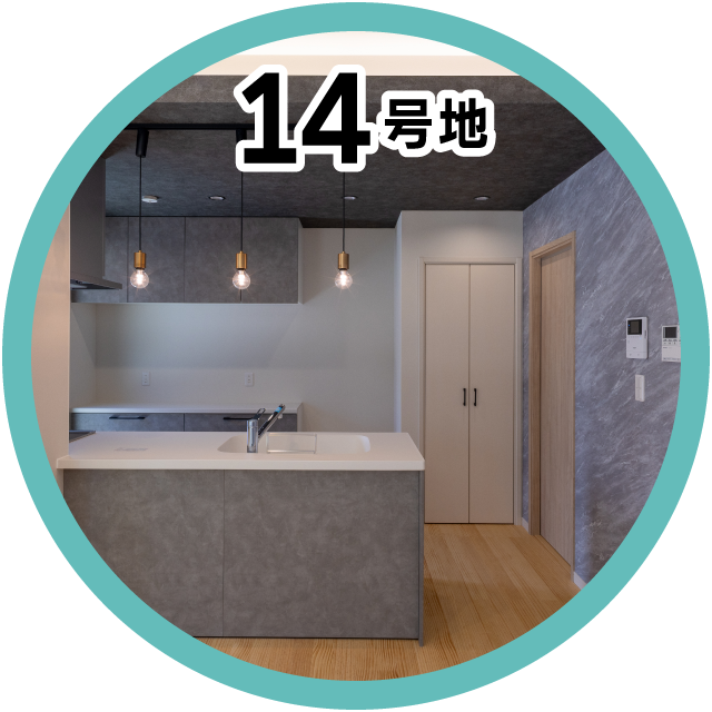 ポイント9号地は、駐車スペース2〜3台可、玄関はシューズインクロークとウォークインクローゼットが完備、リビングダイビングは通常天井高2.4mのところFLEXでは天井高2.7mの開放感、キッチンは、木目とグリーンのカフェ風な配色なため、開放感のあるLDK全体を落ち着いた雰囲気にまとめております。