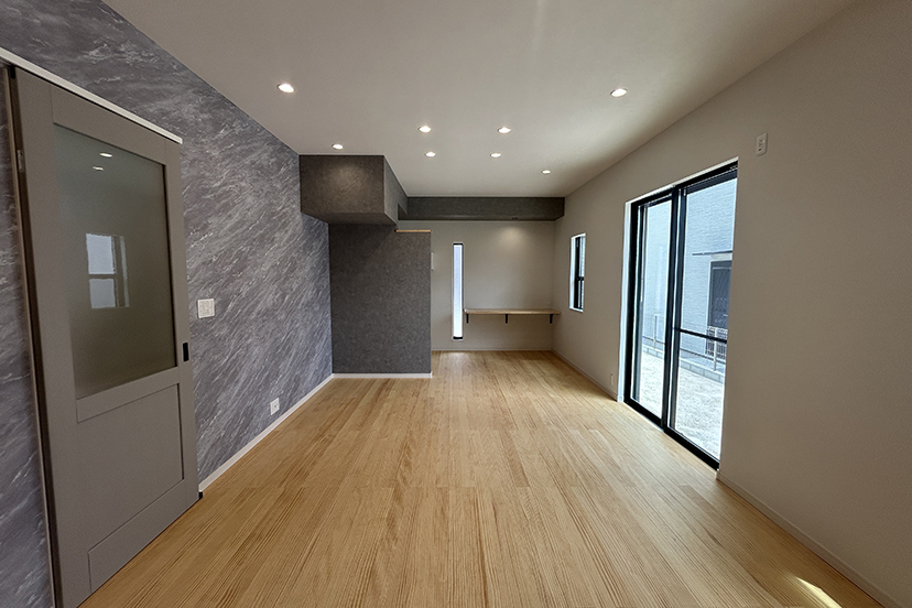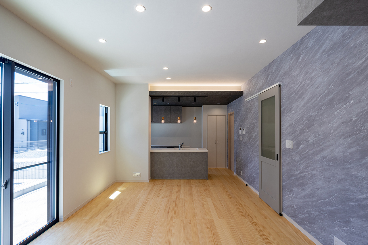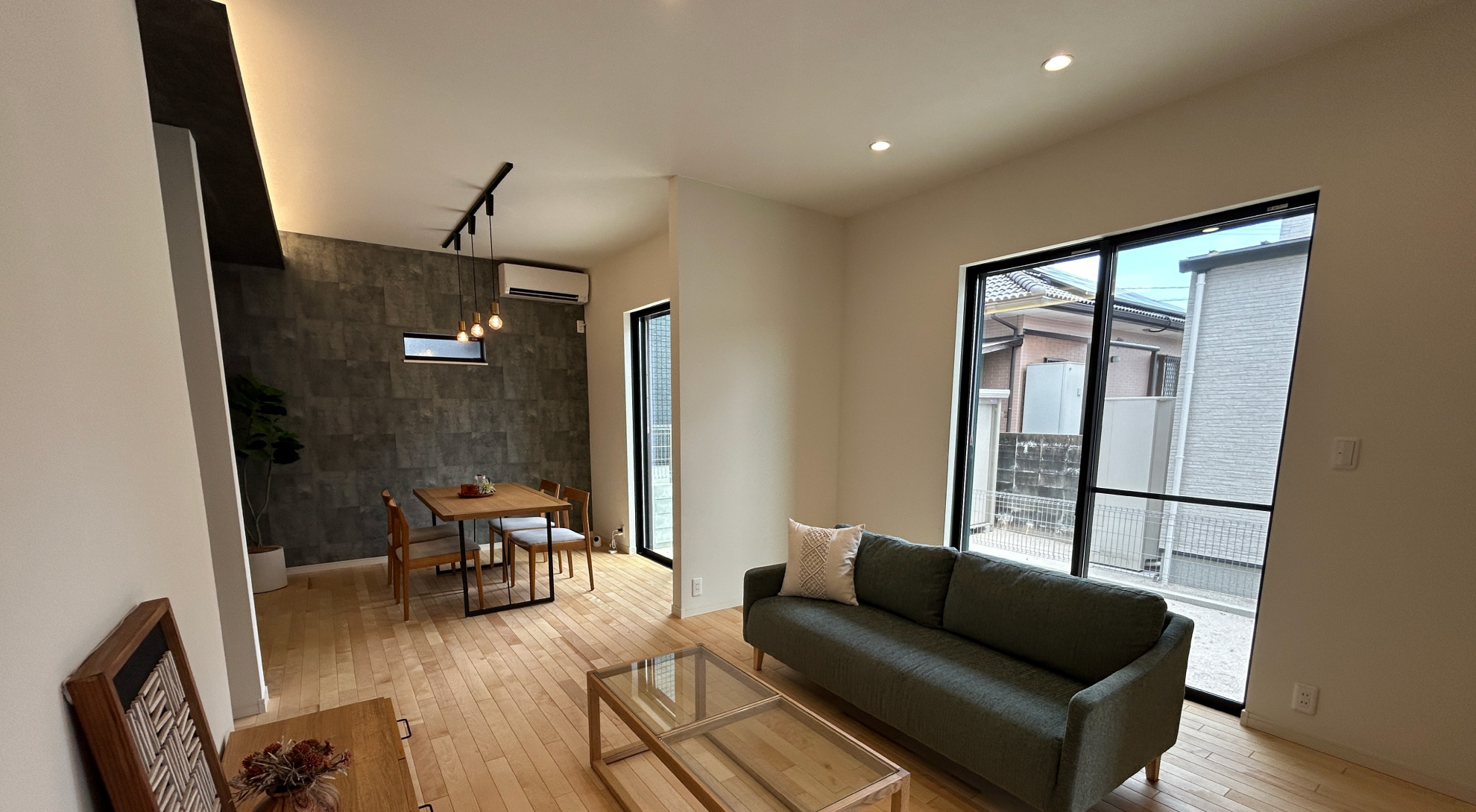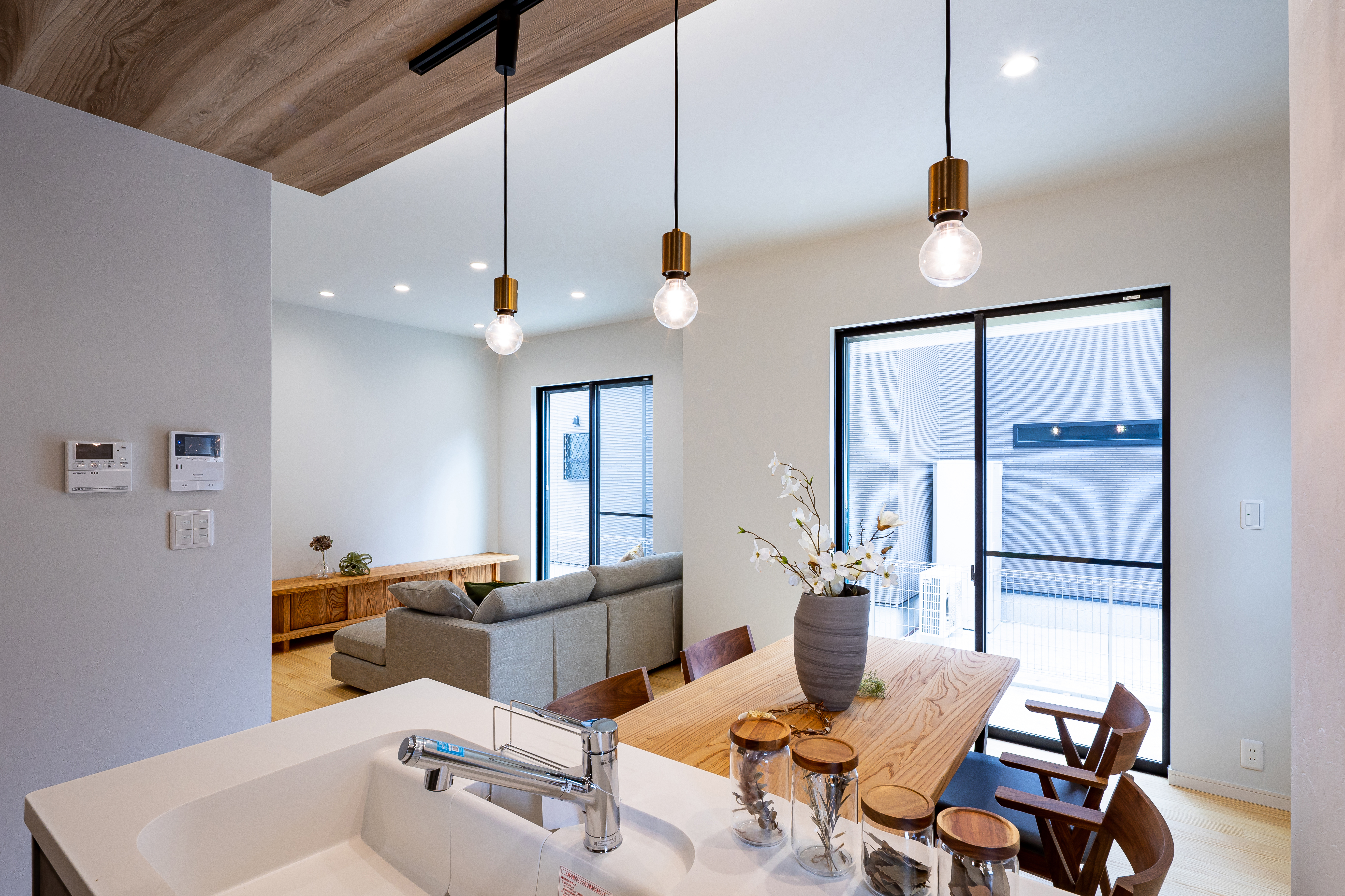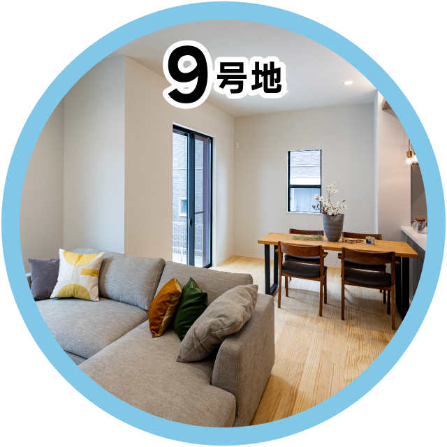 9号地のLDKは、豊富な収納スペースを確保しながらも、開放的な空間設計を実現。家族が自然と集まる心地よいリビングです。