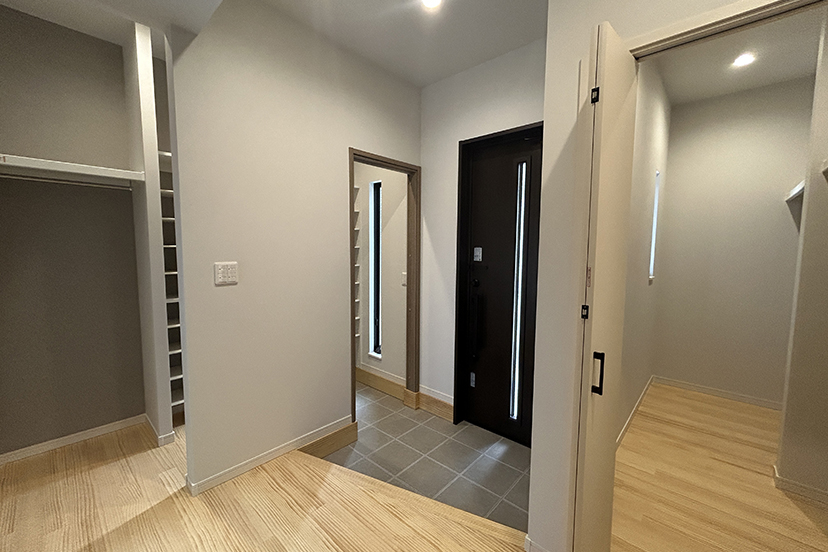ポイント14号地は、駐車スペース2〜3台可、玄関はシューズインクロークあり、リビング横にはまさかのウォークインクローゼットと書斎スペースあり、そのため、在宅ワークの方、読書がお好きな方など、用途別にご家族どなたでも利用可能な素敵な空間を完備、まるでホテルライクな生活をお過ごしできます。