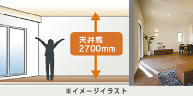 一般的な2,400mmに対して2,700mmを基本採用。視界が広がり、開口もワイドに確保。光と風、そして伸びやかな開放感を実現します。